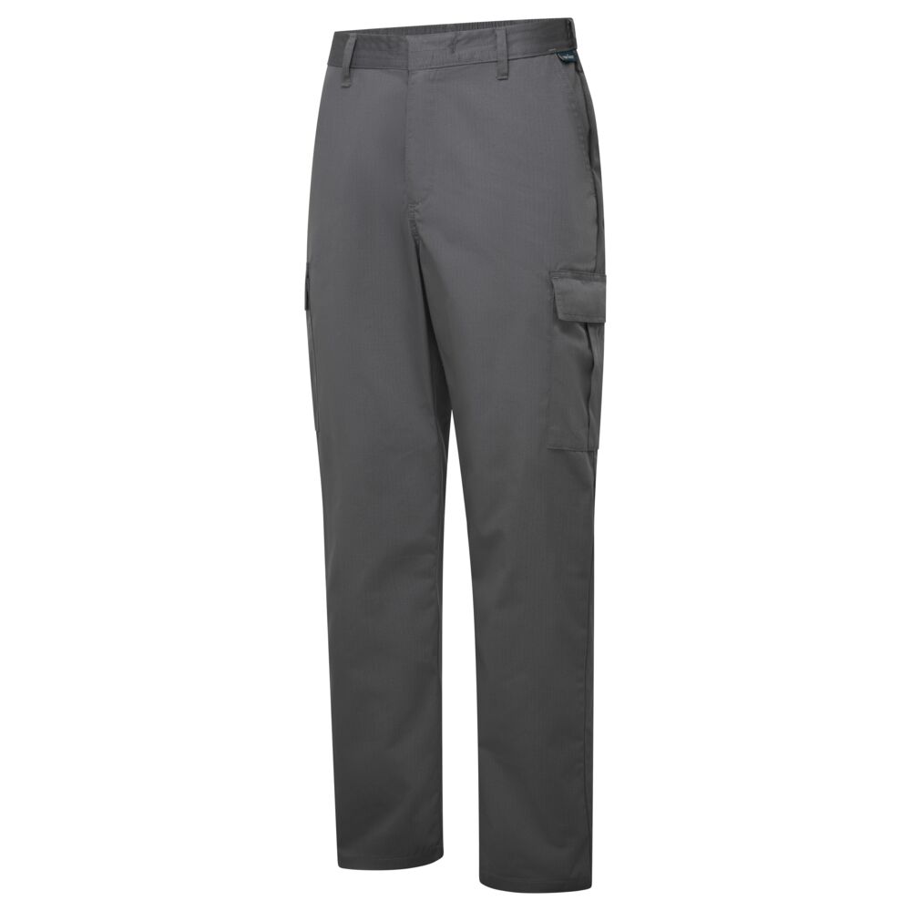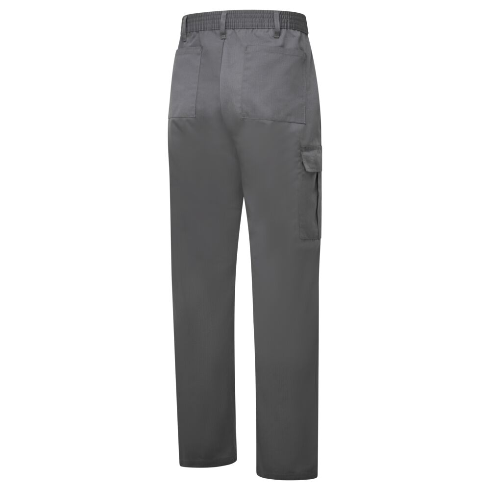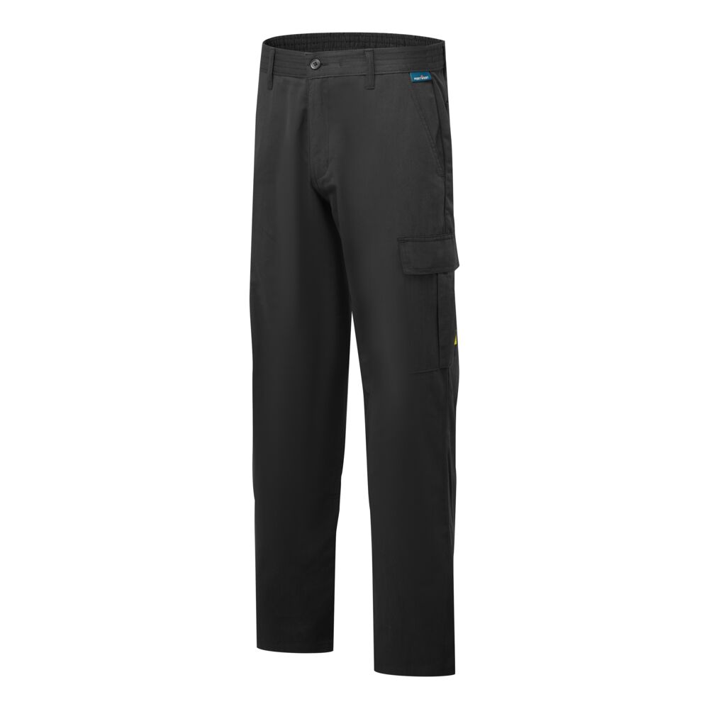 Spodnie robocze ESD unisex, z dużym udziałem bawełny, opracowane z myślą o środowiskach wymagających ochrony przed wyładowaniami elektrostatycznymi (strefy EPA). Materiał oraz elastyczny pas w talii zawierają wplecione włókno węglowe, które zapewnia stałe właściwości antystatyczne. Model nie posiada odsłoniętych elementów metalowych, co chroni wrażliwe komponenty przed zarysowaniami. Spełnia rygorystyczne normy EN 61340-5-1.